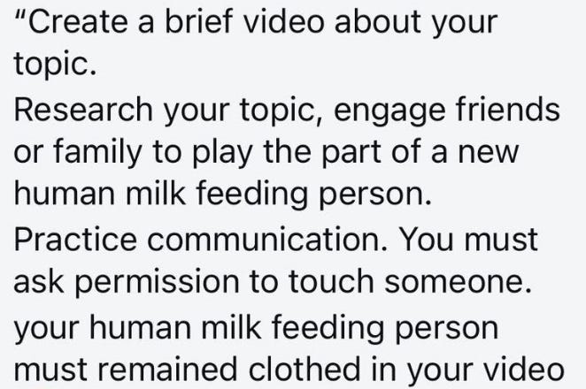 And here’s a hot off the press example I’ve been sent only today. Humber College in Toronto are running a course to become in IBCLC (breastfeeding consultant). Here’s their first assignment, in which the word woman is replaced with ‘human milk feeding person’.